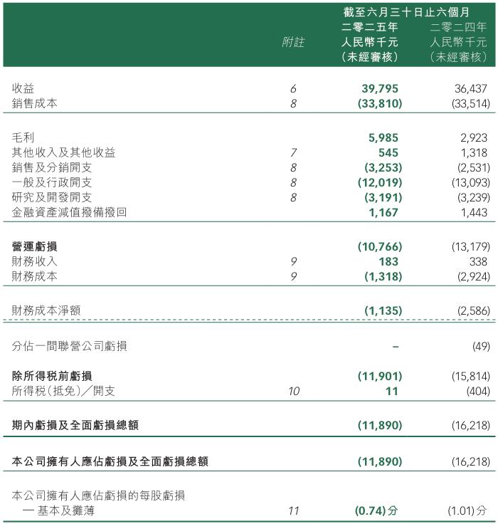 2025年上半年及2024年上半年的除稅后虧損分別約為人民幣11.9百萬(wàn)元及人民幣16.2百萬(wàn)元。