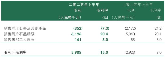 銷售鱗片石墨精礦的毛利及毛利率由2024年上半年的約人民幣5.0百萬(wàn)元及20.1%增加至2025年上半年的約人民幣6.2百萬(wàn)元及20.4%。