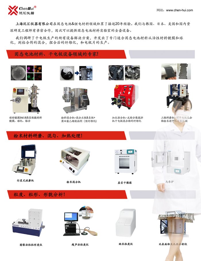 上海沉匯儀器有限公司在固態(tài)電池&鋰電材料領(lǐng)域積累了接近20年經(jīng)驗(yàn)。我們與韓國(guó)、日本、美國(guó)和國(guó)內(nèi)資深研發(fā)工程師有親密合作,因此可以提供固態(tài)電池材料實(shí)驗(yàn)室的全套設(shè)備。