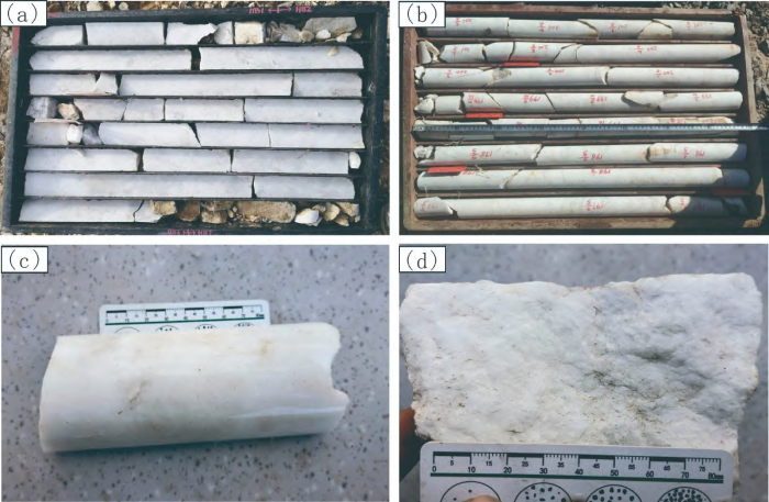 該脈石英礦石特征 a—礦石劈切后巖心;b—礦石巖心;c—礦石巖心標(biāo)本;d—礦石地表標(biāo)本
