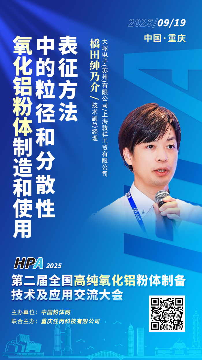 9月19日,中國粉體網(wǎng)將在中國·重慶舉辦2025第二屆全國高純氧化鋁粉體制備技術(shù)及應(yīng)用交流大會。會務(wù)組邀請到大塚電子(蘇州)有限公司技術(shù)副總經(jīng)理橋田紳乃介蒞臨大會現(xiàn)場,并作題為《氧化鋁粉體制造和使用中的粒徑和分散性表征方法》的報告。
