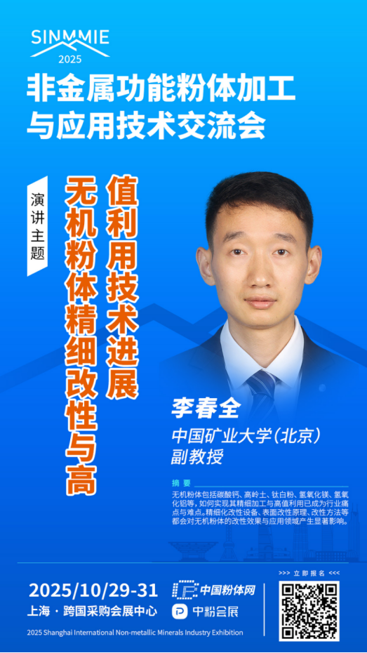 10月29-31日,北京粉體技術協(xié)會、柏德英思展覽(上海)有限公司、山東中粉會展服務有限公司將在上?鐕少彆怪行穆(lián)合主辦“上海國際非金屬礦工業(yè)展覽會(SINMMIE2025)”,展會現(xiàn)場將同期舉辦“非金屬功能粉體加工與應用技術交流會”,屆時將邀請中國礦業(yè)大學(北京)李春全副教授作《無機粉體精細改性與高值利用技術進展》主題報告,講解碳酸鈣、高嶺土、鈦白粉、氫氧化鎂、氫氧化鋁等粉體材料精細加工技術、設備,并展望發(fā)展趨勢,現(xiàn)場與參會嘉賓一起交流互動。