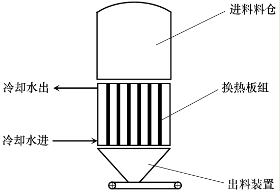 粉體流換熱器是一種間接換熱的粉體冷卻設(shè)備,通常由進(jìn)料倉(cāng)、傳熱板組、下料倉(cāng)等組成。這種換熱方式結(jié)合了粉體密相輸送和傳統(tǒng)板式換熱器的設(shè)計(jì)思路,高溫固體粉料依靠自身重力自流通過板式換熱器的狹窄通道,與另一側(cè)的冷卻水進(jìn)行間接換熱,達(dá)到將物料冷卻的目的,必要時(shí)可以副產(chǎn)熱水,回收熱量。
