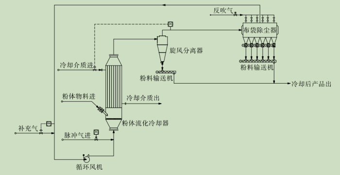 以臥式流化床為例,粉料在流態(tài)化狀態(tài)下依次通過多個(gè)流化腔室,每個(gè)流化腔室下均有冷卻氣體通入,氣體與粉料直接接觸換熱,達(dá)到逐級(jí)冷卻的目的。換熱后的氣體從頂部引出,經(jīng)旋風(fēng)分離器和布袋除塵器后排空。也可以將氣體間接冷卻后循環(huán)使用。