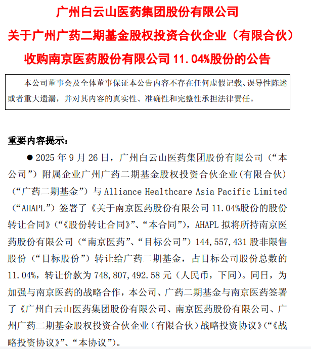 中國粉體網(wǎng)訊 9月28日晚,廣藥集團(tuán)旗下上市公司白云山與南京醫(yī)藥股份有限公司(“南京醫(yī)藥”)同時發(fā)布公告,白云山旗下廣州廣藥二期基金股權(quán)投資合伙企業(yè)(有限合伙)(“廣藥二期基金”)擬出資7.49億元人民幣收購Alliance Healthcare Asia Pacific Limited(“AHAPL”)持有的南京醫(yī)藥股份1.45億股非限售股份,占南京醫(yī)藥總股份數(shù)的11.04%。收購?fù)瓿珊,廣藥二期基金將成為南京醫(yī)藥第二大股東。