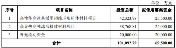 調(diào)整后,擬發(fā)行的可轉(zhuǎn)換公司債券募集資金總額不超過人民幣69,500萬元(含 69,500 萬元),用于高性能高速基板用超純球形粉體材料項目、高導(dǎo)熱高純球形粉體材料項目以及補充流動資金,其計劃投資總額達(dá)到10.1億元。