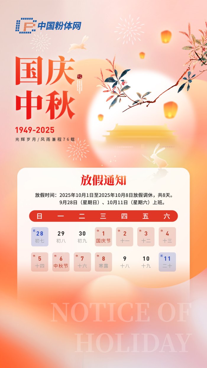 秋風(fēng)送爽,丹桂飄香。值此國(guó)慶佳節(jié)與中秋團(tuán)圓之際,中國(guó)粉體網(wǎng)全體員工向您致以最誠(chéng)摯的祝福,感謝您長(zhǎng)期以來(lái)對(duì)我們的信任與支持!