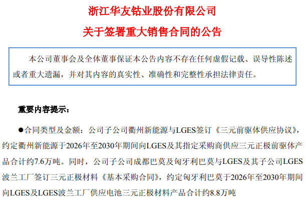 華友鈷業(yè)表示,鋰電新能源材料產(chǎn)業(yè)是公司重點(diǎn)發(fā)展的核心業(yè)務(wù),也是公司產(chǎn)業(yè)一體化的龍頭。本次與LGES及其子公司簽訂長期供貨合同,有利于進(jìn)一步深化雙方戰(zhàn)略合作關(guān)系,在提升公司鋰電新能源材料市場占有率的同時(shí),持續(xù)深化“上控資源、下拓市場、中提能力”的一體化發(fā)展優(yōu)勢(shì),進(jìn)一步增強(qiáng)公司在鋰電新能源產(chǎn)業(yè)鏈中的核心競爭力。合同/協(xié)議對(duì)當(dāng)期不產(chǎn)生重大影響,待正式供貨后,預(yù)計(jì)將對(duì)公司2026年至2030年的經(jīng)營業(yè)績產(chǎn)生積極影響。