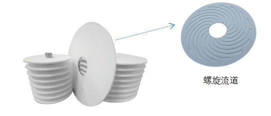 碟式陶瓷膜是一種新興的陶瓷膜構(gòu)型,具有盤式的外部形狀,內(nèi)部有弧形的清液滲透通道,分離層在碟式陶瓷膜的外表面。滲透液通過陶瓷膜表面的分離層進入內(nèi)部的滲透通道,通過中空的中心連接軸將滲透液匯集并排出。較于平板陶瓷膜和管式陶瓷膜,碟式陶瓷膜可以在低跨膜壓差(TMP)下通過膜片自身旋轉(zhuǎn)產(chǎn)生高膜面流速,實現(xiàn)膜面流速與TMP的獨立控制,有效降低濃差極化和緩解膜污染,實現(xiàn)高效過濾。同時,高精度的平面標準確保了低振動和在旋轉(zhuǎn)系統(tǒng)中使用的長壽命。
