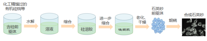 以無機(jī)鹽或有機(jī)硅烷為原料,以醇作為共溶劑,加入酸或堿作為催化劑,進(jìn)行水解,縮聚反應(yīng),形成含硅凝膠,對(duì)凝膠進(jìn)行老化、脫水、干燥、煅燒等處理,得到合成石英砂。