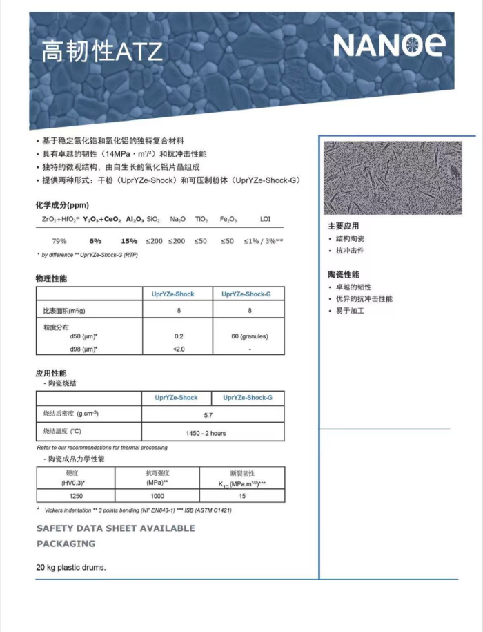不想放棄氧化鋯的高韌性優(yōu)點(diǎn),同時(shí)還要彌補(bǔ)其強(qiáng)度、硬度等方面的不足,法國(guó)NANOE公司選擇采用氧化鋁來(lái)增強(qiáng)氧化鋯基體的方法,推出了適用于定位銷的高韌性ATZ粉體。
