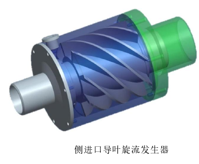 在國(guó)內(nèi),周甲偉等開發(fā)了一種側(cè)進(jìn)口導(dǎo)葉旋流發(fā)生器,該旋流發(fā)生器主要由進(jìn)氣管、一對(duì)法蘭、殼體、導(dǎo)葉管和出水管組成。軸向流(氣體或氣固混合物)通過入口進(jìn)入旋流發(fā)生器,切向流從殼體側(cè)進(jìn)口進(jìn)入,在螺旋葉片的引導(dǎo)下產(chǎn)生切向氣體運(yùn)動(dòng)。旋流與軸向流和切向流結(jié)合,從出口流出。旋流強(qiáng)度是通過切向流和軸向流的比值設(shè)定來(lái)控制。