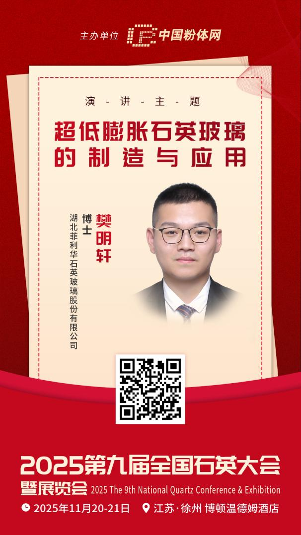 2025年11月20-21日,由中國(guó)粉體網(wǎng)主辦的“2025第九屆全國(guó)石英大會(huì)暨展覽會(huì)”將在江蘇徐州召開(kāi),湖北菲利華石英玻璃股份有限公司的樊明軒博士將做《超低膨脹石英玻璃的制造與應(yīng)用》的報(bào)告,屆時(shí),他將詳細(xì)解讀超低膨脹石英玻璃的制造與應(yīng)用等關(guān)鍵問(wèn)題,為行業(yè)同仁提供極具價(jià)值的參考與借鑒。