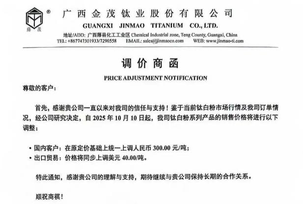 10月10日左右,龍佰集團(tuán)、中核華原鈦白、安納達(dá)、廣西金茂鈦業(yè)、藍(lán)星大華化工、潛江方圓鈦白、云南大互通鈦業(yè)、江蘇鎮(zhèn)鈦化工、攀枝花恒通鈦業(yè)、山東金海鈦業(yè)等多家企業(yè)的鈦白粉開(kāi)始漲價(jià),形成一波集體漲價(jià)浪潮,國(guó)內(nèi)市場(chǎng)調(diào)價(jià)幅度普遍鎖定300元/噸,國(guó)際市場(chǎng)上調(diào)40-50美元/噸不等。