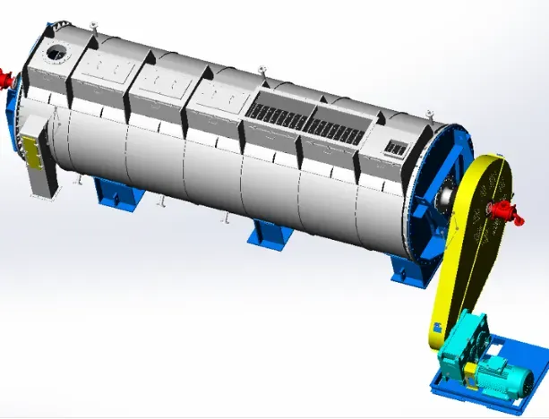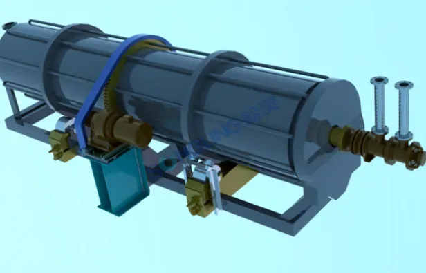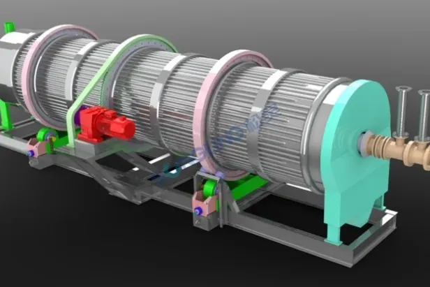 膜式滾筒烘干機(jī)由進(jìn)料體、膜式滾筒、出料體、旋轉(zhuǎn)接頭、水汽管路系統(tǒng)、支撐回轉(zhuǎn)系統(tǒng)、驅(qū)動(dòng)系統(tǒng)、電控系統(tǒng)等單元構(gòu)成。