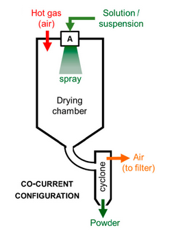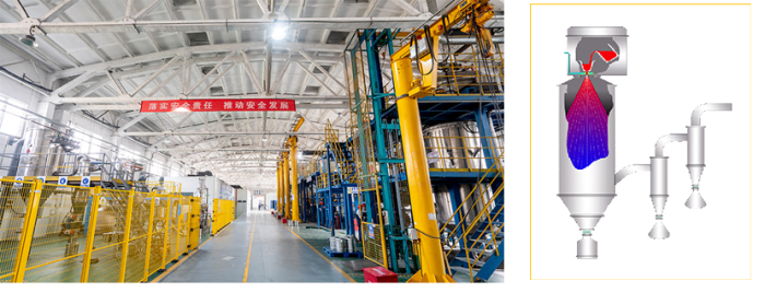 噴霧干燥法是將液態(tài)物質(zhì)霧化為液滴,隨后在熱氣流中水分迅速蒸發(fā),從而凝固為固態(tài)顆粒,噴霧干燥法的優(yōu)點(diǎn)在于工藝簡單,產(chǎn)物性能易于控制,該方法主要應(yīng)用于軍工炸藥與電池領(lǐng)域。