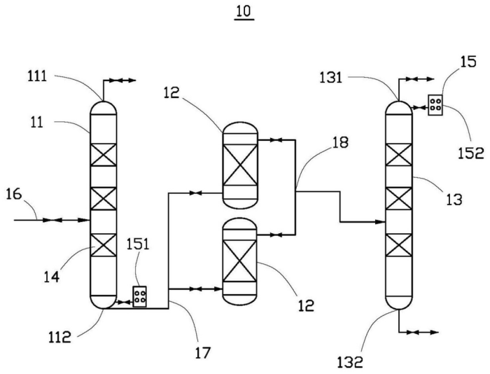 (主要元件符號(hào)說明:四氯化硅提純系統(tǒng)10;脫輕塔11;脫輕塔頂采出口111;脫輕塔釜采出口112;吸附塔12;提純塔13;提純塔頂采出口131;提純塔釜采出口132;加熱盤14;氣相色譜儀15;第一氣相色譜裝置151;第二氣相色譜裝置152;粗硅進(jìn)料管16;吸附進(jìn)料管道17;吸附出料管道18)