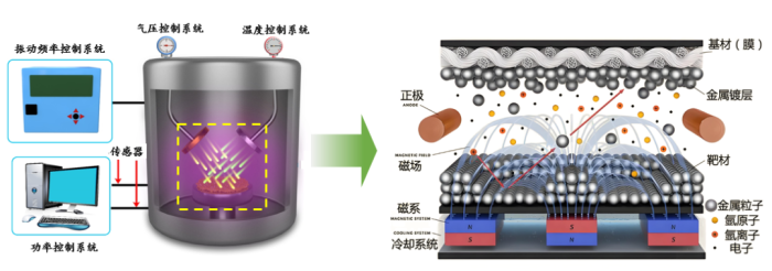 以磁控濺射鍍膜為例,真空系統(tǒng)將鍍膜腔體抽至所需真空度,通入適量的氬氣,在電控系統(tǒng)的作用下,產(chǎn)生大量的高能氬離子(Ar+),這些氬離子(Ar+)在電場的作用下加速轟擊安裝在陰極的靶材表面,靶材表面的原子獲得足夠的能量逸出并進(jìn)入腔體。逸出的靶材原子在氣體介質(zhì)中運(yùn)動,最終在高頻振動的顆粒表面沉積一層薄膜。同時,可根據(jù)需要通入反應(yīng)氣體(如氮?dú)、氧氣等),與靶材原子發(fā)生化學(xué)反應(yīng),形成具有特定性能的化合物薄膜。
