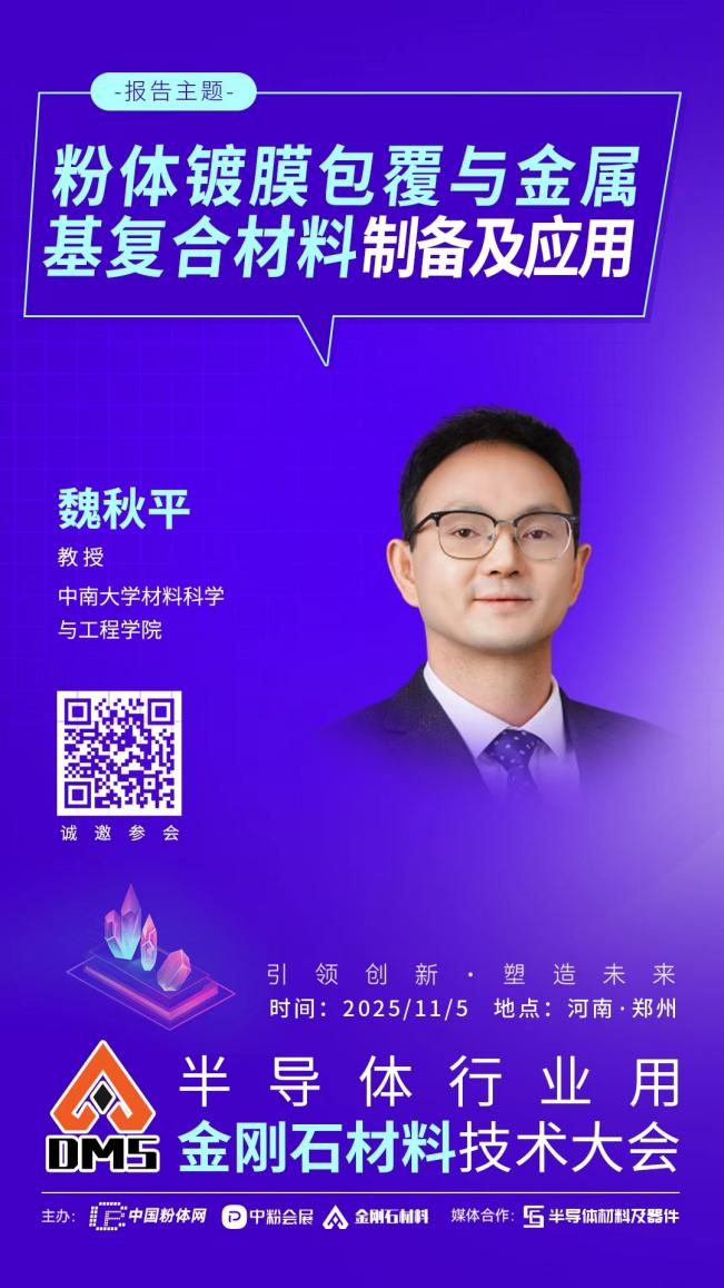 2025年11月5日,中國粉體網(wǎng)將在河南•鄭州舉辦“2025半導(dǎo)體行業(yè)用金剛石材料技術(shù)大會”。屆時,我們邀請到中南大學(xué)魏秋平教授出席本次大會并作題為《粉體鍍膜包覆與金屬基復(fù)合材料制備及應(yīng)用》的報告,報告將介紹真空鍍膜技術(shù)及在金屬復(fù)合材料界面優(yōu)化研究中的應(yīng)用,并就復(fù)合材料規(guī);苽渲忻媾R的界面缺陷控制及成本優(yōu)化問題提出解決方案。