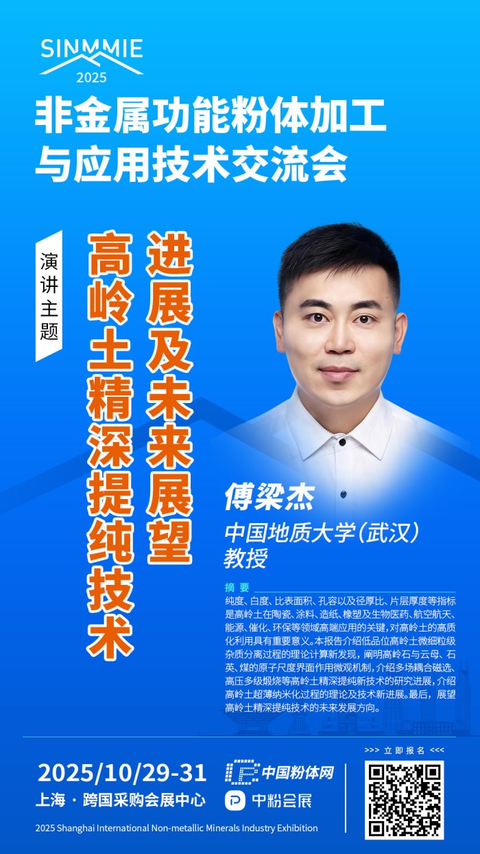 10月29-31日,北京粉體技術協(xié)會、柏德英思展覽(上海)有限公司、山東中粉會展服務有限公司將在上海跨國采購會展中心聯(lián)合主辦“上海國際非金屬礦工業(yè)展覽會(SINMMIE2025)”,展會現(xiàn)場將同期舉辦“非金屬功能粉體加工與應用技術交流會”,屆時將邀請中國地質大學(武漢)傅梁杰教授作《高嶺土精深提純技術進展及未來展望》專題報告,介紹低品位高嶺土分離技術,高嶺石與云母、石英、煤的原子尺度界面作用微觀機制,多場耦合磁選、高壓多級煅燒等技術的研究進展,高嶺土超薄納米化過程的理論及技術新進展等。