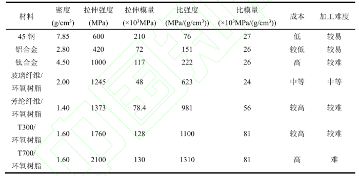 常用于人形機(jī)器人的復(fù)合材料與傳統(tǒng)材料性能比較 來源:《復(fù)合材料在人形機(jī)器人中的應(yīng)用進(jìn)展與趨勢》(熊健等)