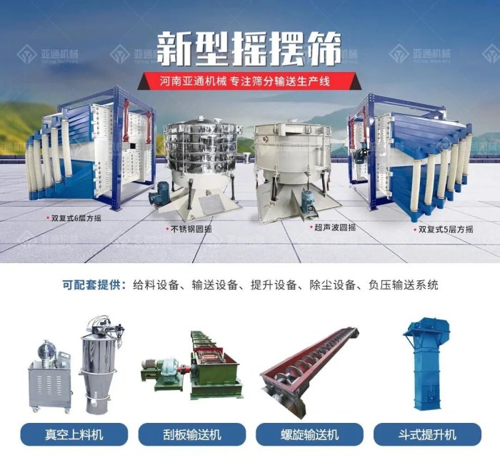 河南亞通機械設(shè)備有限公司位于 “振動之都”新鄉(xiāng),是一家生產(chǎn)銷售振動篩、提升設(shè)備、輸送設(shè)備的骨干企業(yè)。主營: 精細篩分 (方形搖擺篩、圓形搖擺篩、直線振動篩、旋振篩、超聲波振動篩、檢驗篩、直排篩、氣流篩) ,礦用篩分 (脫水篩、概率篩、張弛篩) ,給料設(shè)備 (振動料斗、振動給料機、星型卸料器、電磁給料機) ,輸送設(shè)備 (刮板輸送機、螺旋輸送機、真空上料機、斗式提升機、無塵投料站) ,除塵設(shè)備以及常用備件等。