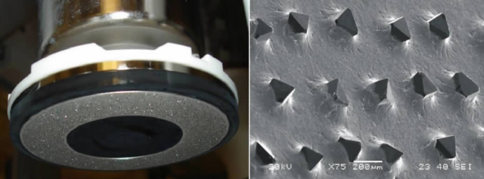 在CMP(化學(xué)機(jī)械拋光)工藝中,拋光墊本身不斷被拋光而變得光滑,使用過(guò)的拋光液以及在拋光過(guò)程中產(chǎn)生的廢棄物會(huì)沉積在拋光墊的表面,這就需要使用修整盤對(duì)拋光墊進(jìn)行修整再生,重新塑造拋光墊的表面粗糙度,恢復(fù)使用性能。修整可以清除堵塞小孔的碎屑和微粒,去除拋光墊的釉面,使拋光墊得到重生,獲得所需的粗糙度和多孔性。此外,修整還可以減少更換拋光墊的次數(shù),節(jié)省使用新拋光墊所需的重新調(diào)整校正到穩(wěn)定的步驟和時(shí)間,從而大大提高CMP工藝的穩(wěn)定性。