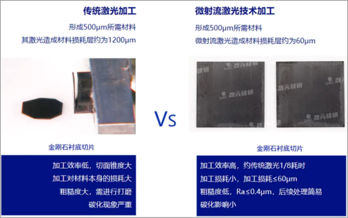 目前晟光硅研已成功研發(fā)出基于水導(dǎo)激光技術(shù)的單晶金剛石加工新工藝。該技術(shù)憑借其獨(dú)特的加工機(jī)理,有效突破了傳統(tǒng)激光加工在大尺寸金剛石材料領(lǐng)域的技術(shù)局限,可實(shí)現(xiàn)超大尺寸單晶金剛石切片,切割損耗小于50μm規(guī)格的金剛石材料的高效、高精度切片,填補(bǔ)了該尺寸段工業(yè)化精密加工的技術(shù)空白。