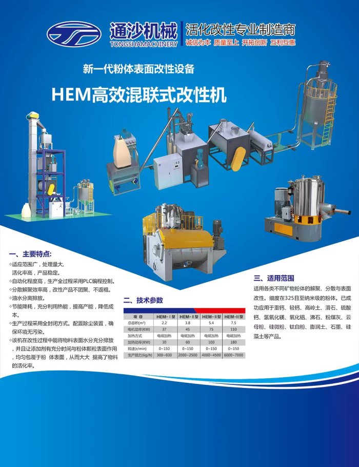 張家港市通沙塑料機(jī)械有限公司是國內(nèi)生產(chǎn)粉體改性機(jī)械的企業(yè)。公司與全國十多所專科院校聯(lián)合開發(fā)新型材料。公司是改性協(xié)會(huì)常務(wù)理事單位之一。從事非金屬礦粉體表面改性及相關(guān)深加工與工藝的研究。公司研發(fā)了新型HEM高效混聯(lián)式改性機(jī),產(chǎn)品質(zhì)量穩(wěn)定提高,操作簡單,節(jié)能降耗效果顯著。另有GX-10至GX-1300小型至大型粉體表面改性機(jī)。適用于各種生產(chǎn)能力及各種粉體種類。包括:輕(重)質(zhì)碳酸鈣、高嶺土、重晶石、滑石、長石、石墨、葉蠟石、水鎂石、硅藻土、氧化鋁、氫氧化鋁、氧化鎂、氧化鋅、硅微粉、硅灰石、黑硅石、沸石等。經(jīng)過幾年的潛心開發(fā)與研究,生產(chǎn)設(shè)備得到進(jìn)一步的完善,目前已成為粉體深加工生產(chǎn)的設(shè)備廠家。