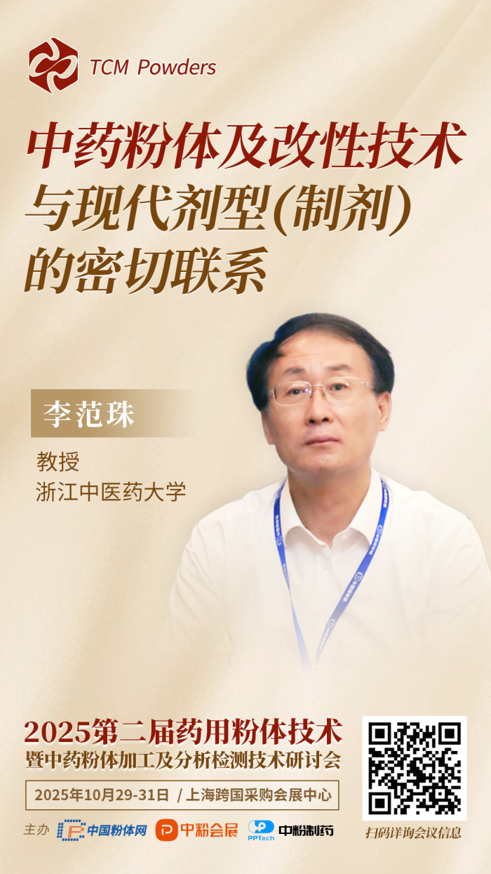 聚焦“從粉體技術(shù)、論中藥工藝”為主題,10月29-31日,中國粉體網(wǎng)將于2025IPIE上海高端粉體裝備與科學(xué)儀器展覽會期間,同期舉辦“2025第二屆藥用粉體技術(shù)暨中藥粉體加工及分析檢測技術(shù)研討會”,屆時浙江中醫(yī)藥大學(xué)李范珠教授將為大家?guī)怼?strong>中藥粉體及改性技術(shù)與現(xiàn)代劑型(制劑)的密切聯(lián)系》的主題報告。