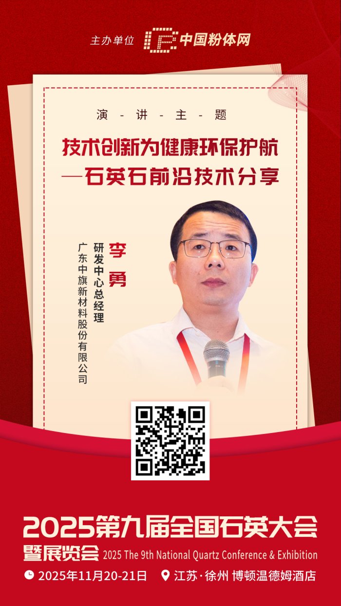 2025年11月20-21日,中國(guó)粉體網(wǎng)將在江蘇徐州舉辦“2025(第九屆)全國(guó)石英大會(huì)暨展覽會(huì)”。屆時(shí),廣東中旗新材料股份有限公司研發(fā)中心總經(jīng)理李勇將帶來題為《技術(shù)創(chuàng)新為健康環(huán)保護(hù)航——石英石前沿技術(shù)分享》的報(bào)告,報(bào)告將深度解讀石英石領(lǐng)域的最新技術(shù)突破方向,分享中旗新材在健康環(huán)保實(shí)踐中的經(jīng)驗(yàn)成果。