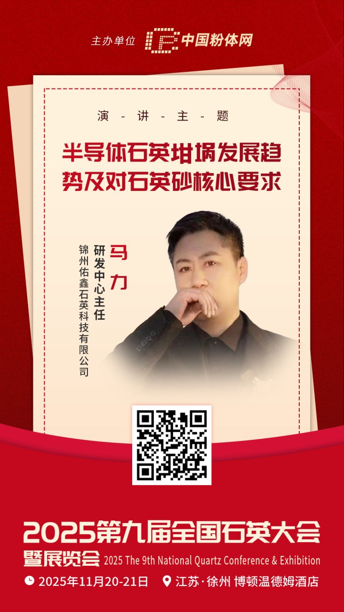 2025年11月20-21日,中國粉體網(wǎng)將在江蘇徐州舉辦“2025(第九屆)全國石英大會(huì)暨展覽會(huì)”。屆時(shí),錦州佑鑫石英科技有限公司研發(fā)中心主任馬力將帶來題為《半導(dǎo)體石英坩堝發(fā)展趨勢及對(duì)石英砂核心要求》的報(bào)告,深入解讀行業(yè)關(guān)鍵技術(shù)與發(fā)展方向。