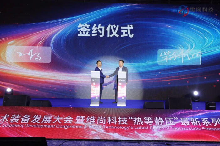發(fā)布會后,湖南維尚科技有限公司董事長柴神洲與滁州歐美克新材料科技有限公司董事長王永富共同簽署“熱等靜壓”設(shè)備采購協(xié)議。