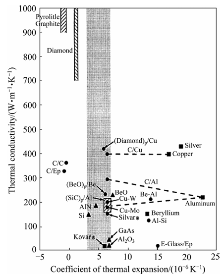 現(xiàn)有的電子封裝材料,如W-Cu、Mo-Cu、SiCp-Al、SiCp-Cu以及BeO-Cu等復(fù)合材料,均難以滿足未來高功率器件的散熱需求,在高輸出模塊的應(yīng)用中表現(xiàn)出局限性。行業(yè)內(nèi)追求更高導(dǎo)熱率的新型材料,金剛石銅就是其中的一種典型復(fù)合材料。