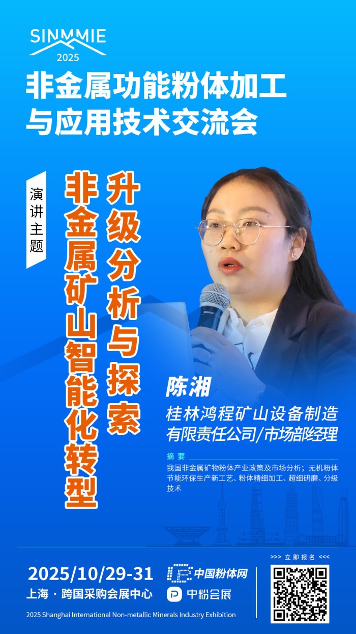 我國礦物加工自動化研究與應(yīng)用相較于國外起步晚,但經(jīng)過近年來的技術(shù)進步以及企業(yè)對生產(chǎn)效率的要求,自動化技術(shù)與智能控制技術(shù)已經(jīng)應(yīng)用在礦物加工的各個環(huán)節(jié)。10月29-31日,北京粉體技術(shù)協(xié)會、柏德英思展覽(上海)有限公司、山東中粉會展服務(wù)有限公司將在上海跨國采購會展中心聯(lián)合主辦“上海國際非金屬礦工業(yè)展覽會(SINMMIE2025)”,展會現(xiàn)場將同期舉辦“非金屬功能粉體加工與應(yīng)用技術(shù)交流會”,屆時將邀請桂林鴻程礦山設(shè)備制造有限責任公司市場部經(jīng)理陳湘作《非金屬礦山智能化轉(zhuǎn)型升級分析與探索》專題報告,分享無機粉體節(jié)能環(huán)保生產(chǎn)新工藝、粉體精細加工技術(shù)、超細研磨技術(shù)、分級技術(shù)。