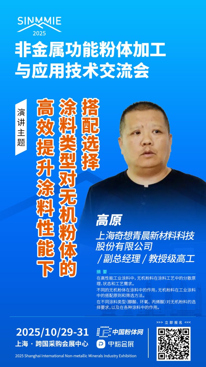10月29-31日,北京粉體技術(shù)協(xié)會、柏德英思展覽(上海)有限公司、山東中粉會展服務有限公司將在上?鐕少彆怪行穆(lián)合主辦“上海國際非金屬礦工業(yè)展覽會(SINMMIE2025)”,展會現(xiàn)場將同期舉辦“非金屬功能粉體加工與應用技術(shù)交流會”,屆時將邀請上海奇想青晨新材料科技股份有限公司副總經(jīng)理高原作《高效提升涂料性能下,涂料類型對無機粉體的搭配選擇》專題報告,現(xiàn)場分享無機粉體材料在高性能涂料中的應用工藝,不同無機粉體在涂料中的作用,不同涂料類型(醇酸、環(huán)氧、丙烯酸)對無機粉料的選擇要求等內(nèi)容。