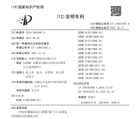 中國粉體網(wǎng)訊 近日,中鋼天源股份有限公司正式獲得國家知識產(chǎn)權(quán)局授權(quán)的發(fā)明專利“一種釹鐵硼磁體的石墨烯-量子點(diǎn)-金屬復(fù)合防腐涂層的制備方法”。這一創(chuàng)新成果成功解決了長期制約高性能釹鐵硼磁體應(yīng)用的耐腐蝕性難題。
