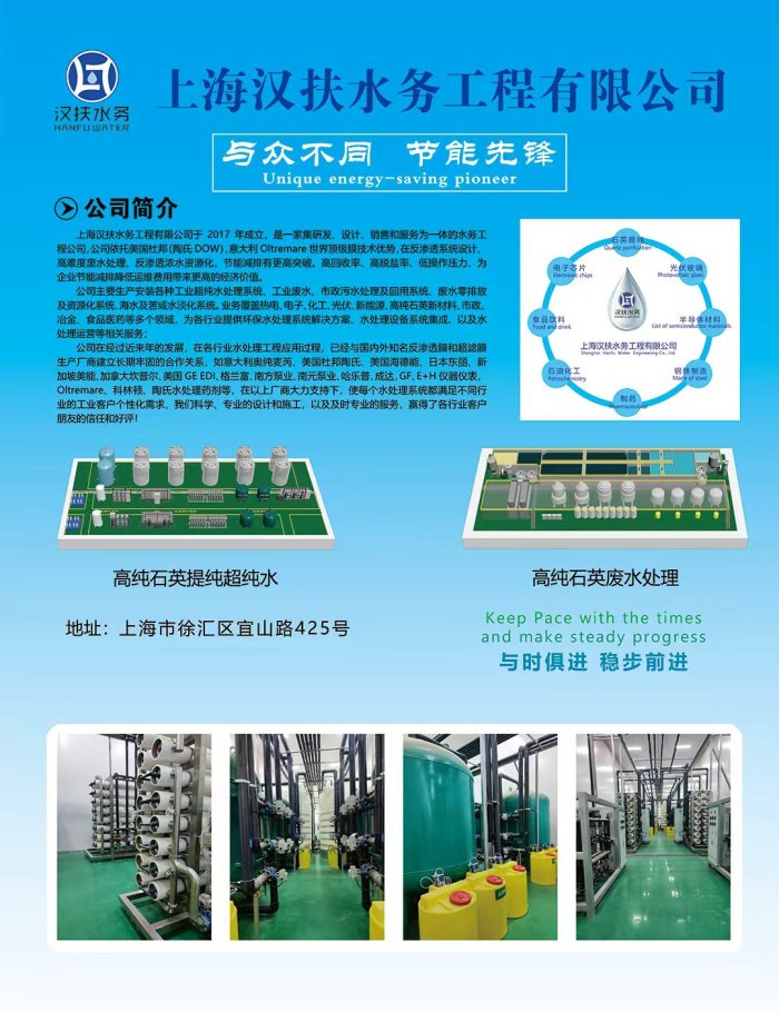 上海漢扶水務工程有限公司于 2017 年成立,是一家集研發(fā)、設計、銷售和服務為一體的水務工程公司,公司依托美國杜邦(陶氏 DOW),意大利 Oltremare 世界頂級膜技術優(yōu)勢,在反滲透系統(tǒng)設計、高難度廢水處理、反滲透濃水資源化,節(jié)能減排有更高突破。高回收率、高脫鹽率、低操作壓力、為企業(yè)節(jié)能減排降低運維費用帶來更高的經(jīng)濟價值。