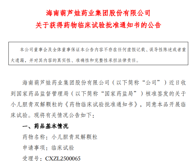 中國粉體網(wǎng)訊 10月27日,ST葫蘆娃發(fā)布公告,宣布公司近日已獲得國家藥品監(jiān)督管理局核準(zhǔn)簽發(fā)的關(guān)于中藥創(chuàng)新藥小兒膽青雙解顆粒的《藥物臨床試驗批準(zhǔn)通知書》,該通知書同意小兒膽青雙解顆粒開展臨床試驗。