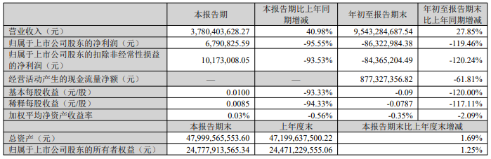 據(jù)恩捷股份發(fā)布的2025年第三季度報告來看,截止報告期末,公司實現(xiàn)營業(yè)總收入約95.43億元,同比上升27.85%,歸母凈利潤約-8632.3萬元,同比下降119.46%。按單季度數(shù)據(jù)看,第三季度營業(yè)總收入約37.8億元,同比上升40.98%,第三季度歸母凈利潤約679.08萬元,同比下降95.55%。