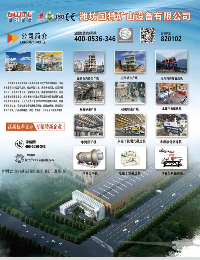 濰坊國(guó)特礦山設(shè)備有限公司總部坐落于歷史文化名城青州,公司占地面積約50000平方米,成立于2013年,歷經(jīng)十年沉淀,公司產(chǎn)值數(shù)億元,是國(guó)家高新技術(shù)企業(yè)、專(zhuān)精特新企業(yè),被評(píng)為創(chuàng)新型企業(yè),山東省創(chuàng)新研發(fā)中心,濰坊市硅材料重點(diǎn)實(shí)驗(yàn)室和市級(jí)非金屬礦山提純?cè)O(shè)備工程實(shí)驗(yàn)室。公司產(chǎn)品先后通過(guò)ISO9001質(zhì)量體系認(rèn)證、環(huán)境管理體系認(rèn)證、職業(yè)健康安全管理體系認(rèn)證、歐盟ce認(rèn)證、擁有國(guó)家專(zhuān)利幾十項(xiàng)。產(chǎn)品遠(yuǎn)銷(xiāo)韓國(guó)、印度、東南亞、非洲等多個(gè)國(guó)家及地區(qū)。