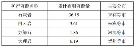 廣西主要碳酸鈣礦產(chǎn)資源儲(chǔ)量情況及分布 單位:億噸