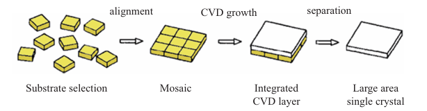 目前制備大尺寸單晶金剛石的技術(shù)主要有反復生長法、異質(zhì)外延法和馬賽克拼接法。馬賽克拼接法是精選厚度一致、晶向取向一致、方形的優(yōu)質(zhì)小金剛石單晶片作為籽晶,并拼接成面積較大的單晶金剛石襯底,其中,必須保證種晶接觸位置的晶向要盡可能完美匹配,然后在較大的單晶金剛石襯底上同質(zhì)外延生長單晶金剛石,最后得到大面積單晶金剛石。由于合成的單晶襯底缺陷與位錯密度小,因此馬賽克拼接法是目前研究合成英寸級單晶金剛石最優(yōu)的技術(shù)。