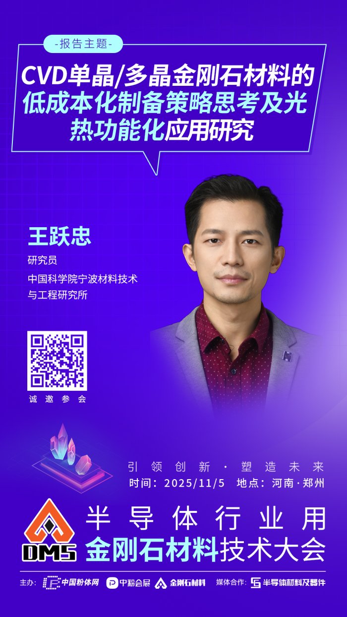 2025年11月5日,中國粉體網(wǎng)將在河南•鄭州舉辦“2025半導體行業(yè)用金剛石材料技術(shù)大會”。屆時,我們將邀請到中國科學院寧波材料技術(shù)與工程研究所王躍忠研究員出席本次大會并作題為《CVD單晶/多晶金剛石材料的低成本化制備策略思考及光熱功能化應用研究》的報告。報告將介紹大尺寸單晶金剛石(馬賽克拼接法)、多晶金剛石薄膜制備及應用等相關(guān)成果,為金剛石材料的低成本化應用提供參考。