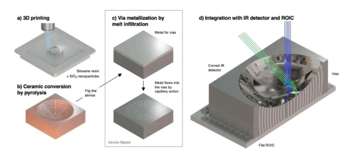 休斯研究實(shí)驗(yàn)室(由波音與通用汽車聯(lián)合創(chuàng)立的前沿技術(shù)研發(fā)機(jī)構(gòu))采用摩方microArch® S230高精度3D打印系統(tǒng),成功制備出具有微米級(jí)通孔陣列的陶瓷中介層。該技術(shù)實(shí)現(xiàn)了通孔直徑9μm、間距18μm的突破性指標(biāo),并通過創(chuàng)新的熔融滲透金屬化工藝,構(gòu)建了高密度互連的電氣通路。這項(xiàng)技術(shù)不僅攻克了傳統(tǒng)高溫共燒陶瓷的結(jié)構(gòu)限制,重新定義了微電子系統(tǒng)的集成模式,還顯著縮小了實(shí)心孔尺寸,通過3D打印技術(shù)重構(gòu)了微電子封裝的底層邏輯,為陶瓷封裝領(lǐng)域開辟了全新的技術(shù)路徑。