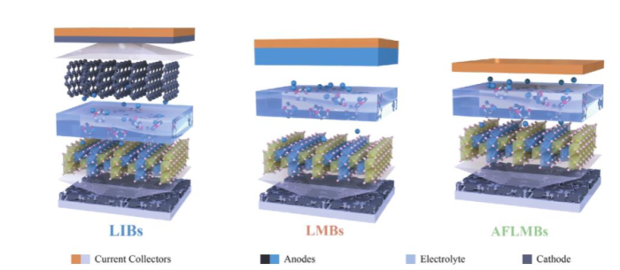 AF-LMBs主要由正極、隔膜、電解液和負(fù)極集流體構(gòu)成。其關(guān)鍵技術(shù)是直接利用正極材料(如LiFePO4:磷酸鐵鋰,NCM:鎳鈷錳酸鋰等)自身的活性鋰儲存,放棄傳統(tǒng)鋰金屬作為負(fù)極,從而降低電池系統(tǒng)質(zhì)量,提高電化學(xué)循環(huán)性能。