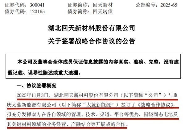 中國粉體網(wǎng)訊 11月3日,湖北回天新材料股份有限公司(簡稱:回天新材)發(fā)布公告稱,公司與重慶太藍(lán)新能源有限公司(簡稱:太藍(lán)新能源)簽訂了《戰(zhàn)略合作協(xié)議》,擬充分發(fā)揮雙方在各自領(lǐng)域的管理、技術(shù)、渠道、平臺等優(yōu)勢,圍繞固態(tài)電池及其關(guān)鍵材料領(lǐng)域的業(yè)務(wù)經(jīng)營、產(chǎn)融結(jié)合等開展戰(zhàn)略合作。