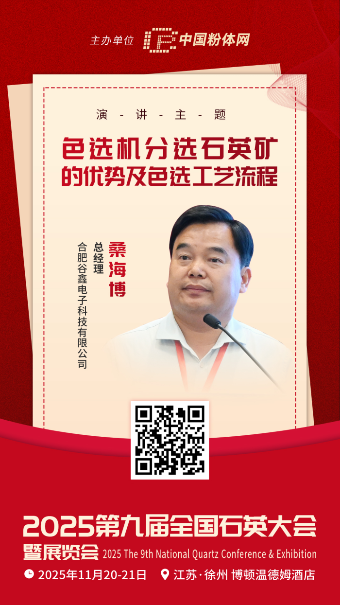 2025年11月20-21日,中國(guó)粉體網(wǎng)將在江蘇徐州舉辦“2025(第九屆)全國(guó)石英大會(huì)暨展覽會(huì)”。屆時(shí),合肥谷鑫電子科技有限公司總經(jīng)理桑海博,將帶來(lái)題為《色選機(jī)分選石英礦的優(yōu)勢(shì)及色選工藝流程》的報(bào)告。他將結(jié)合公司實(shí)踐經(jīng)驗(yàn),深度解讀色選機(jī)分選石英礦的優(yōu)勢(shì)及色選工藝流程。