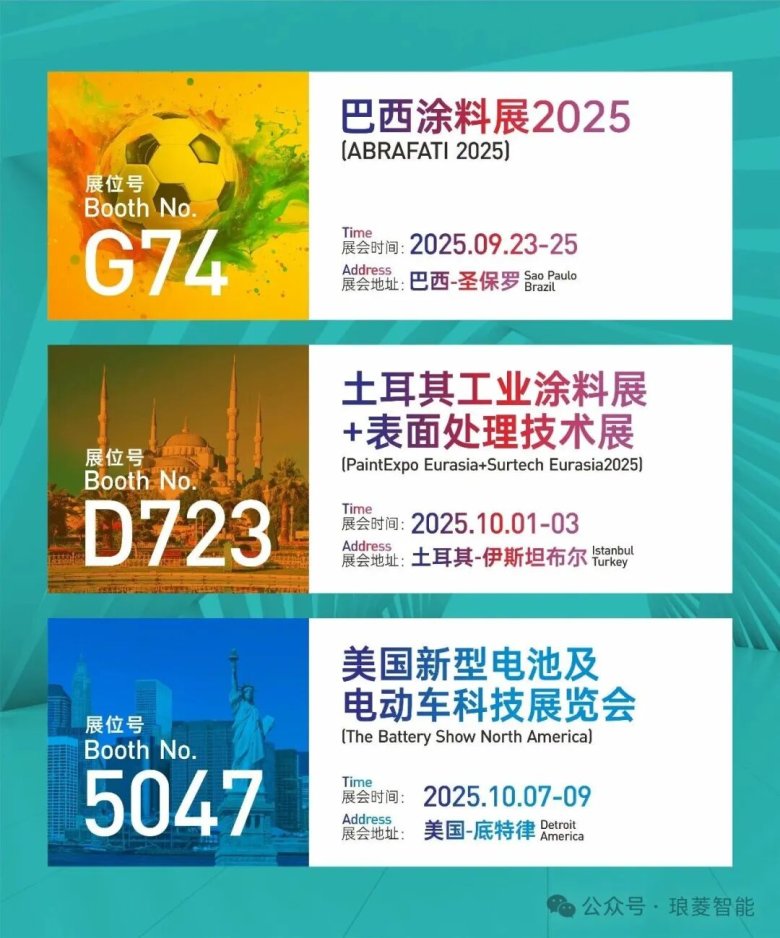 展會名稱:巴西圣保羅涂料展覽會 展位號:瑯菱智能 ? 展位G74 日期:2025年9月23-25日 地點:巴西圣保羅會展中心 2025年9月23-25日,巴西涂料展將于巴西圣保羅會展中心隆重舉辦?,樍庵悄軐⒃谡箷礼74展臺攜NT-V10L系列智能納米研磨系統(tǒng)驚艷亮相,為南美市場帶來智能裝備領域的創(chuàng)新解決方案,向世界展示中國高端智造的實力與魅力! 巴西涂料展,是南美洲具影響力的涂料裝備展和涂料原料展,也是南美洲規(guī)模最大、最具影響力的涂料專業(yè)展覽會,展會面積和觀眾數(shù)量不僅在南美首屈一指,而且在全球涂料行業(yè)中也名列前茅,是中國涂料企業(yè)進軍南美洲最佳貿易平臺。 ▲ 納米砂磨機 NT-V 10L 展會現(xiàn)場,明星展品NT-V10L系列亮點包括智能核心升級、精度突破創(chuàng)新、智能運維革新。技術人員每日技術講座,深度解讀展品NT-V10L系列技術創(chuàng)新;瑯菱技術團隊實地操作展示,直觀體驗設備性能,現(xiàn)場解惑。 展會名稱:2025土耳其工業(yè)涂料展+表面處理技術展 展位號:瑯菱智能 ? 展位D723 日期:2025年10月1-3日 10月1-3日,第八屆國際工業(yè)涂料技術博覽會將于土耳其伊斯坦布爾國際會展中心隆重舉辦?,樍庵悄軐⒃谡箷﨑723展臺精彩亮相,重點展示針對涂料行業(yè)的一站式解決方案。 土耳其不僅是歐亞大陸的重要樞紐,更是中東地區(qū)涂料市場的核心之一。其涂料市場規(guī)模已突破20億美元,并保持強勁增長勢頭。隨著汽車、建筑等行業(yè)迅速發(fā)展和環(huán)保需求提升,土耳其正快速向水基涂料等環(huán)保型技術轉型,為高端涂料設備帶來巨大機遇。本次展會也因此成為全球行業(yè)目光的焦點。 ▲ 涂料產(chǎn)線模型圖 本屆展會規(guī)??涨?,預計迎來超多的專業(yè)觀眾、1000+行業(yè)品牌、40+國家和地區(qū)代表共話前沿技術。瑯菱智能將帶來針對涂料行業(yè)的高端研磨解決方案,現(xiàn)場我們的技術團隊還將為您帶來定制專屬技術方案,解決生產(chǎn)痛點、優(yōu)化效益,提供面對面咨詢服務。 展會名稱:2025美國新型電池及電動車科技展覽會 展位號:瑯菱智能 ? 展位5047 日期:2025年10月7-9日 10月7-9日,全球新能源行業(yè)盛會——美國新型電池及電動車科技展覽會將于底特律舉行,瑯菱智能將在展會5047展臺精彩亮相,并展示技術成果:NT-V2L系列及磷酸鐵鋰電池模型,面向世界舞臺展現(xiàn)在新能源領域的創(chuàng)新實力。 這個展覽會是北美先進的電池技術及電動車科技盛會,匯集了10,000多名工程師和管理人員以及700多家供應商,全面展示電動和混合動力汽車的先進電池以及關鍵電源技術,將成為新能源領域研發(fā)成果和前沿解決方案的展示舞臺。 ▲ 納米砂磨機 NT-V 2L 作為一家專注于新能源智能裝備與系統(tǒng)解決方案的企業(yè),瑯菱智能始終致力于推動電池技術的發(fā)展和電動車產(chǎn)業(yè)的升級。本次參展,瑯菱智能將重點呈現(xiàn)NT-V2L系列以及磷酸鐵鋰電池方案,并且現(xiàn)場提供設備運行動態(tài)演示及技術團隊深度講解,我們始終秉持“讓好裝備成為您企業(yè)的核心競爭力”,期待為全球客戶創(chuàng)造更多價值! 歡迎各位行業(yè)伙伴、媒體朋友及專業(yè)人士蒞臨瑯菱智能展位交流洽談,共同探索更多可能性!01 巴西