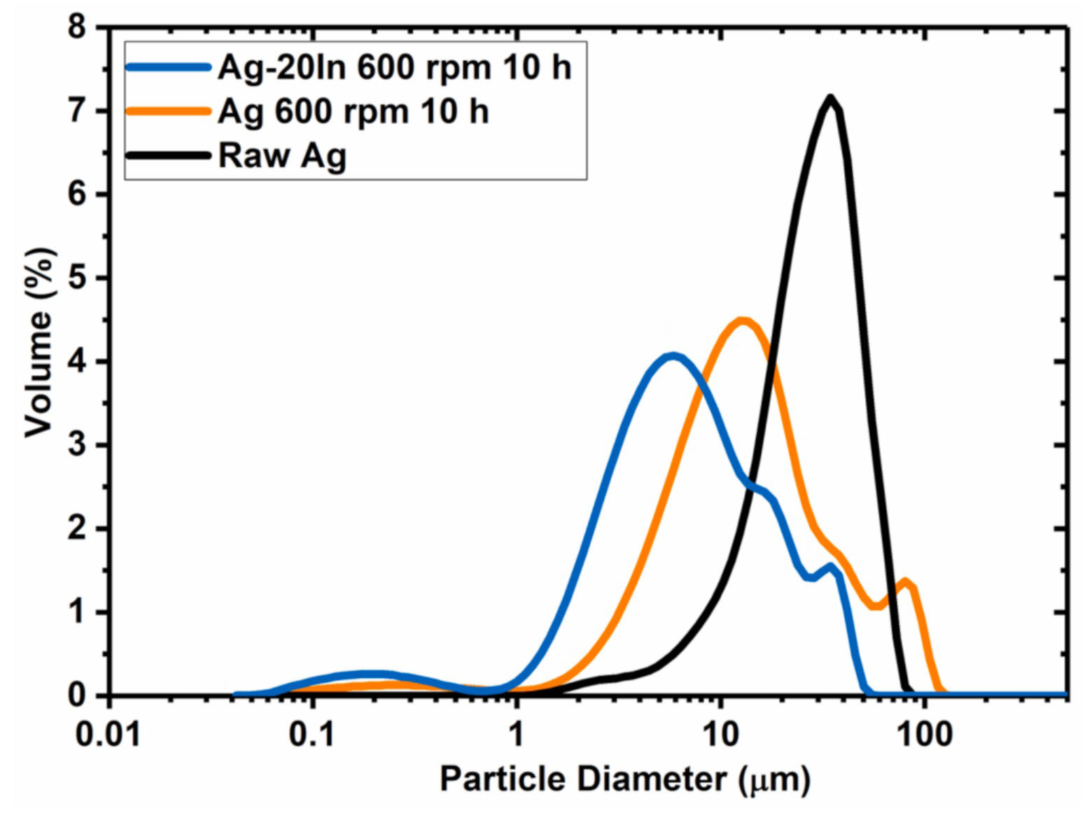 由于Ag粉/In粉本身具有延展性,故在研磨過程會產(chǎn)生冷焊效應,造成明顯的團聚,可通過添加適當?shù)挠仓醽碛行У匾种啤?/p>